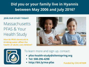 Massachusetts PFAS & Your Health Study is a five-year effort led by Silent Spring Institute in collaboration with Harvard T.H. Chan School of Public Health and Eastern Research Group. The study is focusing on two communities in Eastern Massachusetts—Hyannis and Ayer—where public drinking water supplies have been contaminated by PFAS from the use of firefighting foams at nearby fire training areas. It is one of seven projects funded by the U.S. Centers for Disease Control and Prevention (CDC) and the Agency for Toxic Substances and Disease Registry (ATSDR) as part of the ATSDR Multi-Site Health Study on PFAS. Community partners include Massachusetts Breast Cancer Coalition (MBCC) and People of Ayer Concerned about the Environment (PACE).